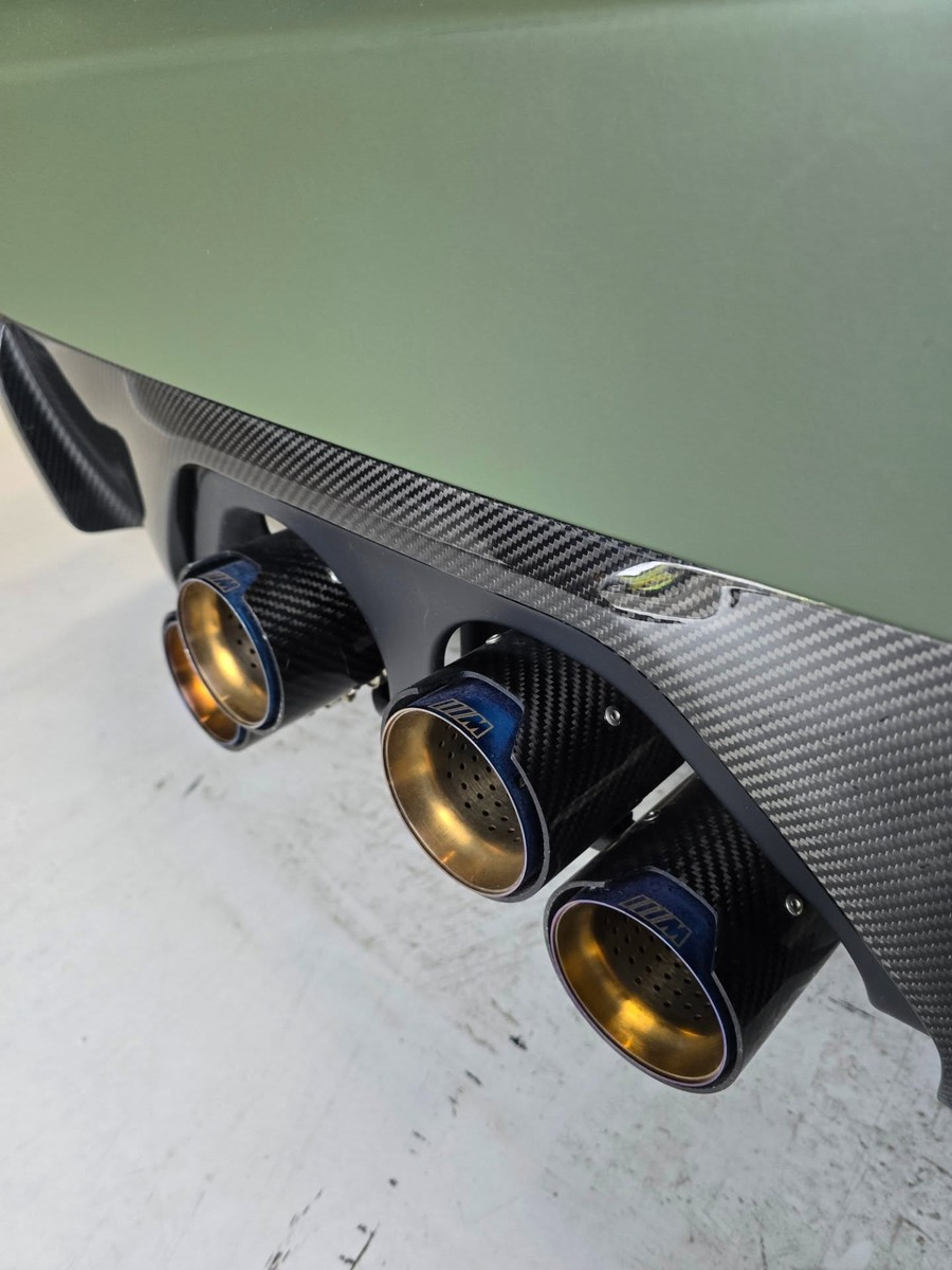 At the rear, the stock exhaust has been jettisoned for a menacing quad-tip setup with gold/bronze heat-treated tips. This isn’t just for show; it mimics the exotic metallurgy of high-end titanium systems, suggesting a soundtrack that matches the visual volume. The stance is aggressive, likely achieved through a height-adjustable spring kit that tucks the aggressive wheel offsets deep into the flared G87 arches.