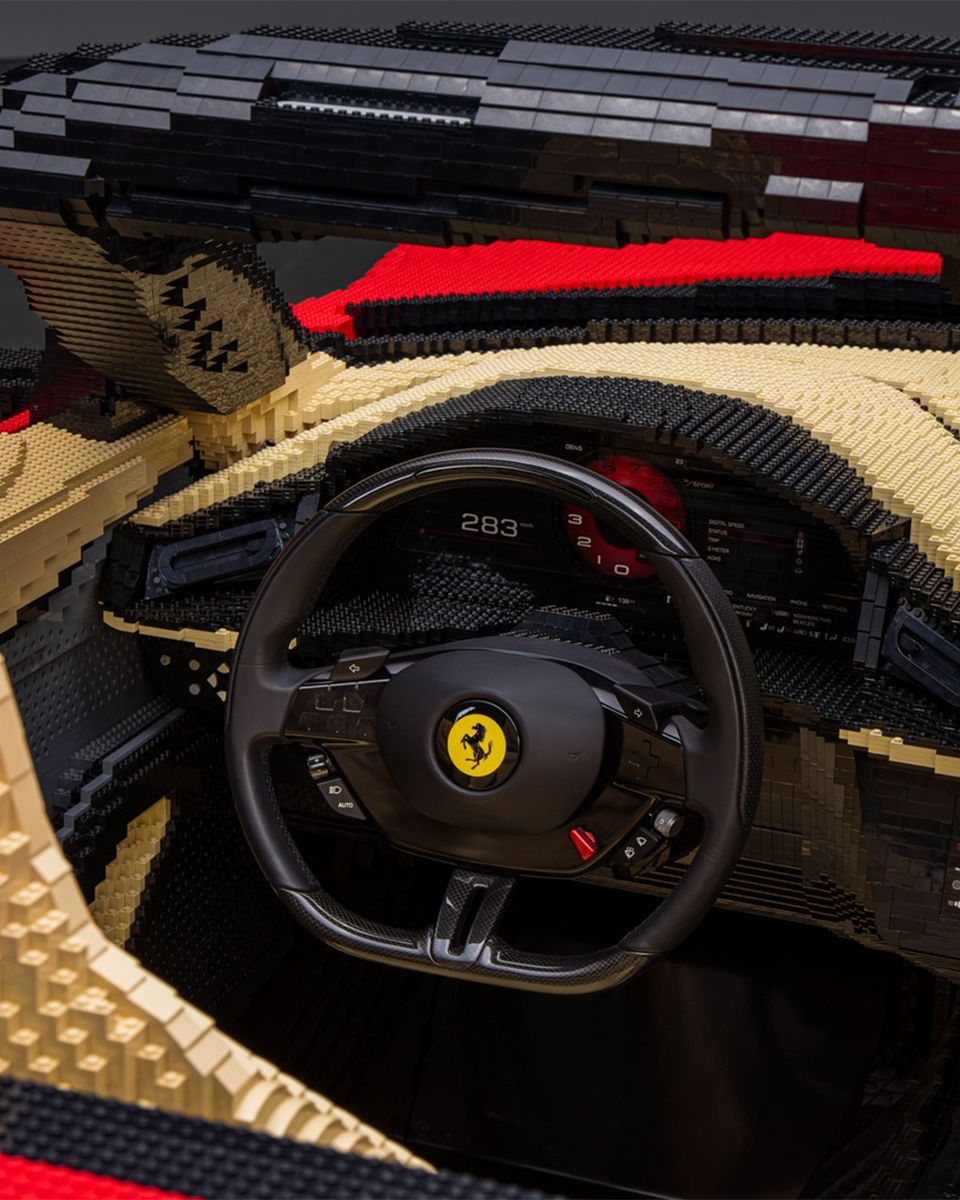 - The world’s largest LEGO Ferrari model weighs 4,000 pounds and consists of 554,767 bricks assembled over 2,300 grueling hours.