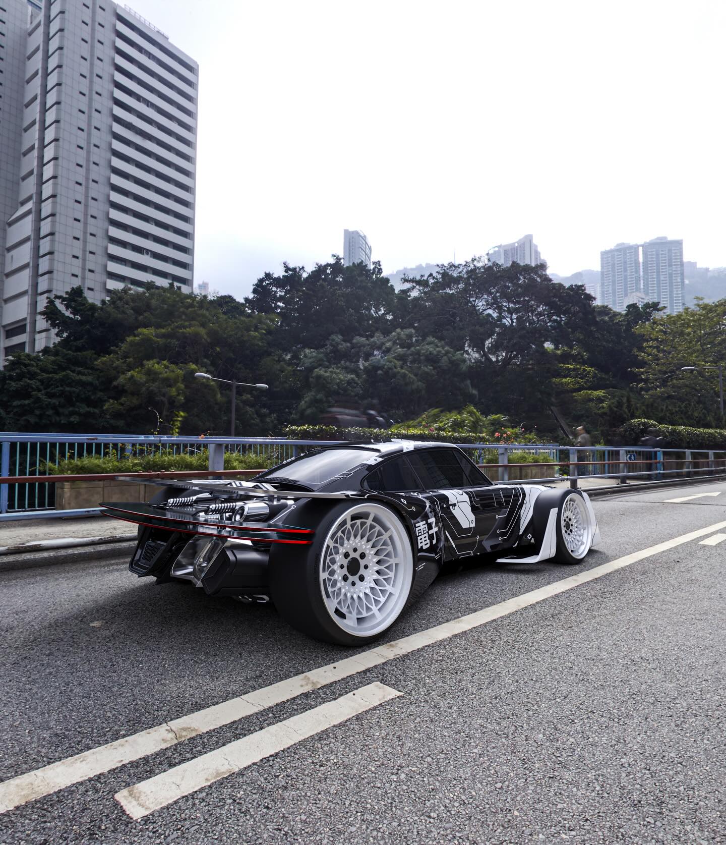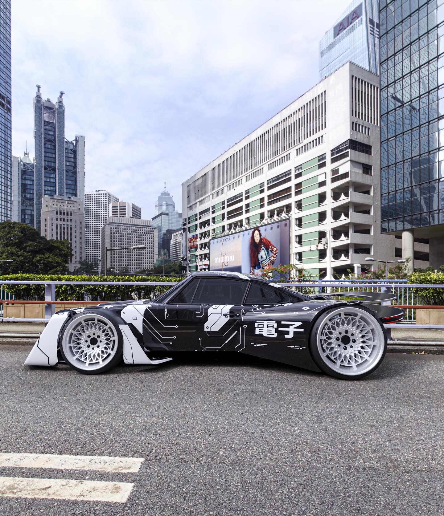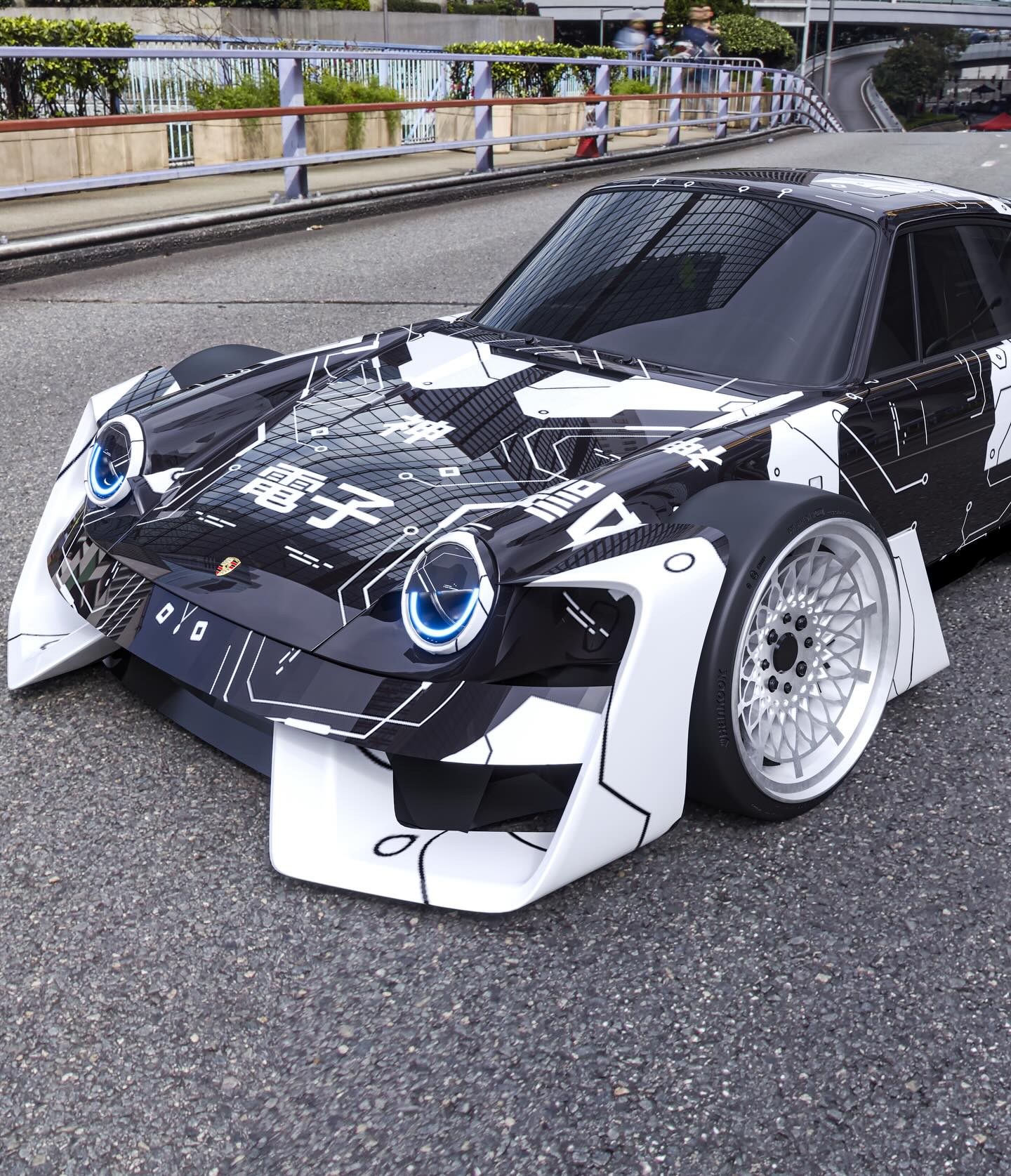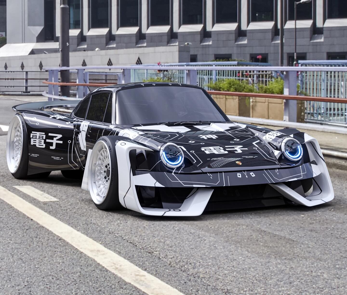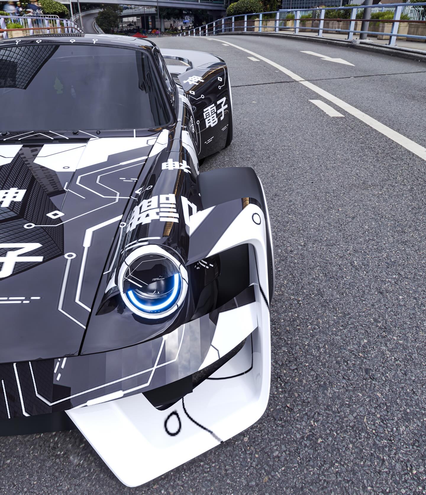 Livery: A distinctive black and white geometric wrap adorns the body, featuring intriguing Japanese characters. Notably, the character “電子” (Denshi), meaning “electronic” or “electronics,” subtly reinforces its digital, high-tech identity.