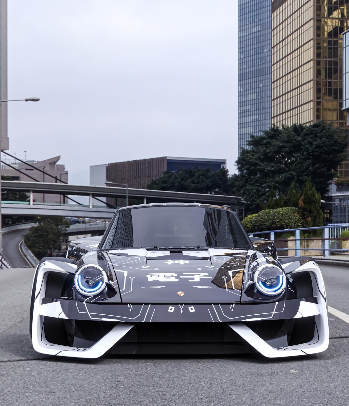 Lighting: The iconic 911 headlights are transformed into futuristic “halo” style LED units, emitting a cool blue circular glow that cuts through the imagined urban nightscapes.