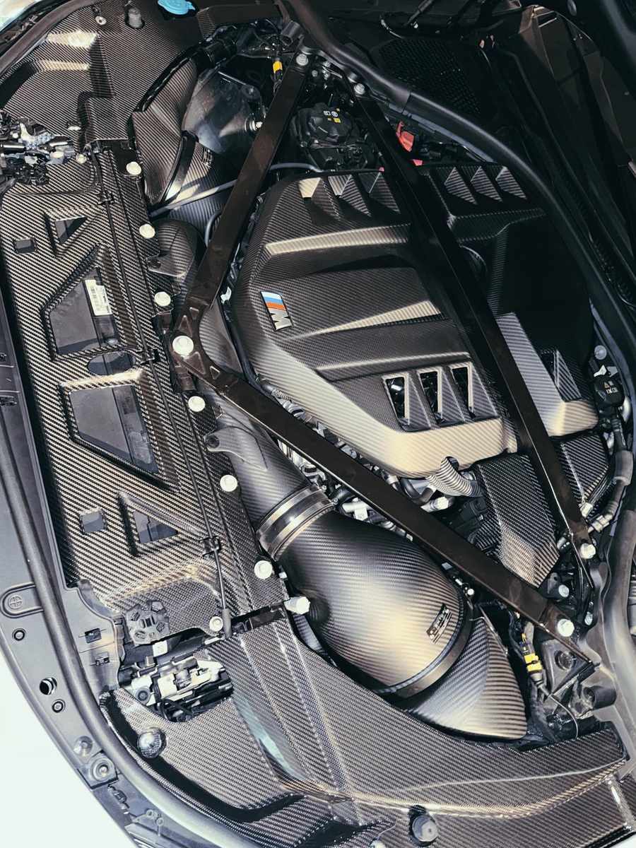 Beneath the vented hood lies the heart of the beast: BMW’s S58 3.0L Twin-Turbo Inline-Six. In this “Silver Surfer” configuration, the engine bay is a gallery of carbon fiber, dominated by an Eventuri Carbon Fiber Strut Brace and intake system. These upgrades aren’t merely cosmetic; they streamline airflow to the turbos, a critical modification for a platform where power outputs regularly scale from the factory 453 hp to well over 500 hp with simple tuning. The engine bay is finished with a Deluxe Dress Up titanium hardware kit, ensuring that even the bolts reflect the car’s aerospace inspiration.